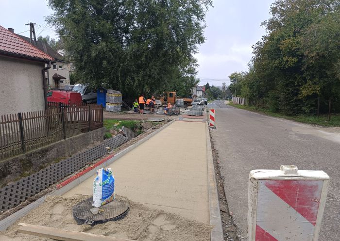 Prace przy budowie chodnika, który zastąpi istniejące wcześniej pobocze są już na etapie układania nawierzchni z kostki brukowej. Inwestycja zbliża się do końca realizacji.