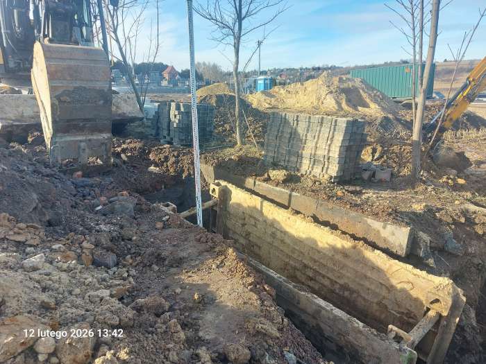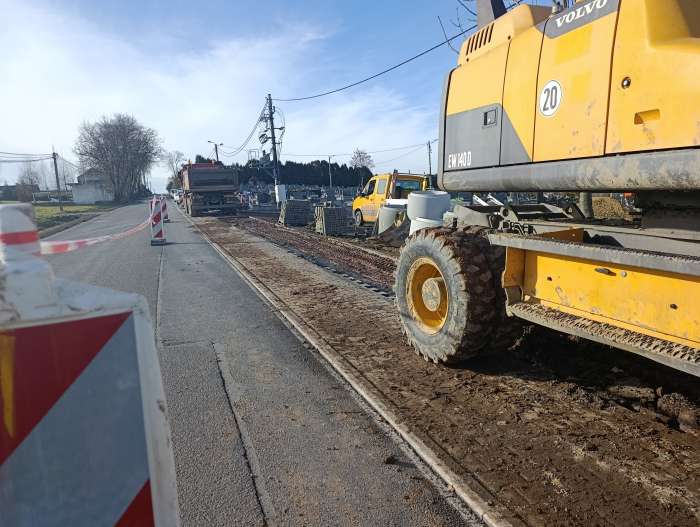 Trwa budowa kanalizacji sanitarnej, w ramach przebudowy drogi 2152K w Michałowicach. Prace rozpoczęły się po wprowadzeniu tymczasowej organizacji ruchu 9 lutego 2026 r.